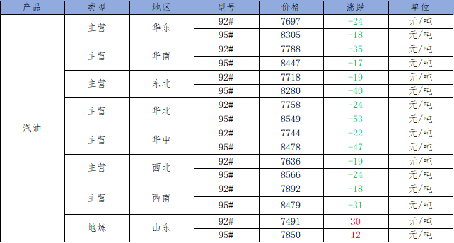 主营汽油:国际原油收盘走跌,市场面利空影响,今日主营汽油价格继续走跌。后期原油价格预计区间震荡,国内零售限价或上调,消息面指引一般。随着多地降雨来袭,气温下降,空调用油减少,汽油需求逐步转弱。近期汽油市场暂无节假提振,业者入市操作谨慎,市场消费较为疲软,主营单位价格一再下压。