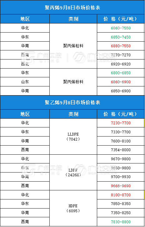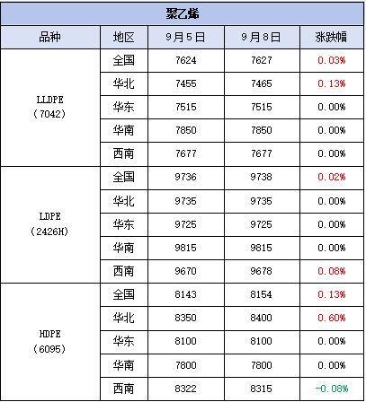 今日,聚乙烯市场窄幅整理,价格零星上调。LLDPE(7042)市场价格为7627元/吨,较上一工作日上涨3元/吨,涨幅为0.03%;LDPE(2426H)市场价格为9738元/吨,较上一工作日上涨2元/吨,涨幅为0.02%;HDPE(6095)市场价格为8154元/吨,较上一工作日下上涨11元/吨,涨幅为0.13%。OPEC+进一步增产将加剧国际能源供应过剩,国际原油价格下跌,成本支撑减弱。下游需求提升缓慢,市场交投较为谨慎,部分聚乙烯厂商试探性调整价格,整体聚乙烯市场行情维持震荡运行。