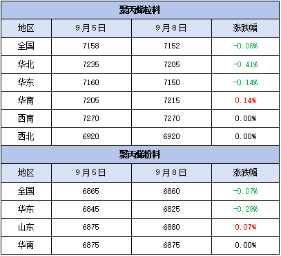 今日,聚丙烯市场弱势整理,价格窄幅涨跌。PP粒料均价为7152元/吨,较上一工作日下跌6元/吨,跌幅为0.08%;PP粉料均价为6860元/吨,较上一工作日下跌5元/吨,跌幅为0.07%。OPEC+同意从10月起进一步提高石油产量,国际原油价格承压下行,成本支撑有限。当前虽处于消费旺季,但实际需求回升缓慢,叠加供应端压力较大,聚丙烯价格上涨驱动力不足,厂商大多让利出货,价格重心小幅下移。