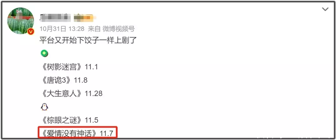 据了解,该剧于2024年8月31日开机,2025年2月15日杀青,预计在今年十一月初播出。根据网上曝光的央八节目单中可以看到,《爱情没有神话》计划在11月7日正式和观众见面。此外,许多业内人士也在十月末的时候就曝光了鹅厂排播情况,《爱情没有神话》赫然在列,时间和央八节目单上的时间也是一致的。