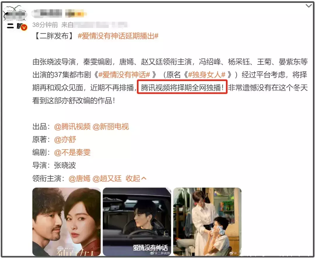 此外,根据知情博主的爆料可以了解到,鹅厂很可能会将《爱情没有神话》择期全网独播。众所周知,央视播剧一向谨慎,会慎重考虑舆论风险,所以,该剧日后想要上星央视恐怕是难上加难了,至于能不能上星其他卫视,还要看出品方之后的对接情况。本来板上钉钉的央八上星大剧,如今因为秦雯的袭警风波上星困难,真是让人唏嘘啊。