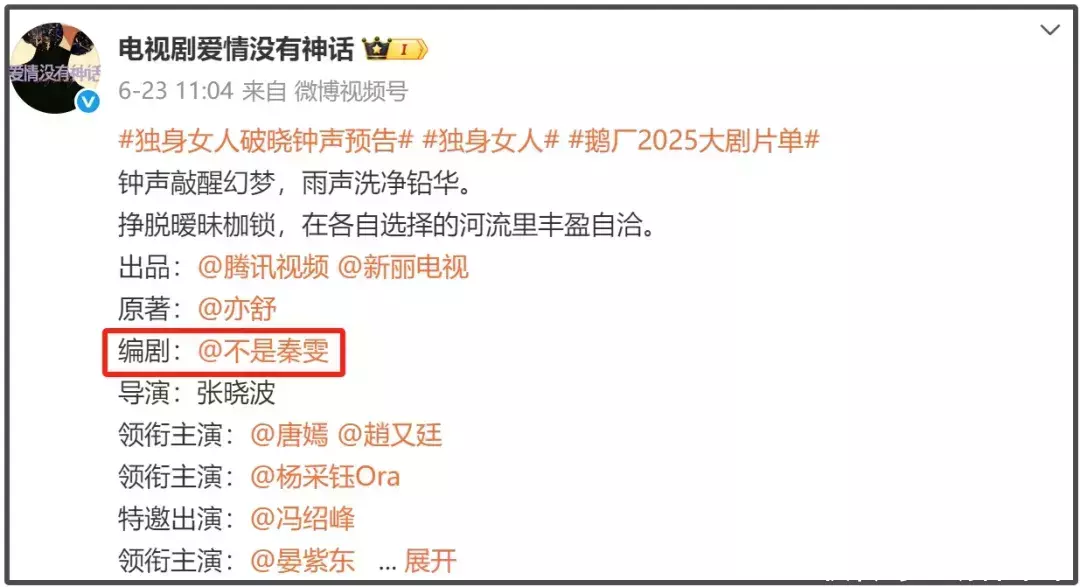 值得一提的是,这部剧是唐嫣继《繁花》之后和秦雯的再次合作,这一次的合作中,秦雯作为编剧更是“地位超然”。在内娱番位等级森严的今时今日,秦雯作为编剧的番位仅次于出品方和原著作者,单独排在第三行,番位不但在导演之上,更是力压两位主演。