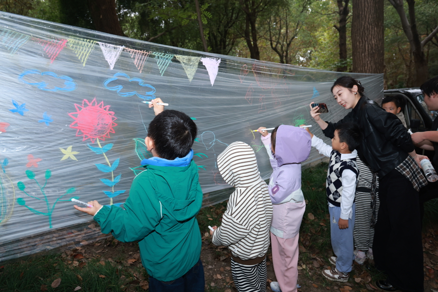 秋日市集上,宠物零食试吃、环保玩具展示、萌宠服饰展示等摊位前围满了居民。美育互动区则通过森系科普走廊和一米美育墙,让亲子家庭在艺术创作中感受生态文明社区的魅力和活力。